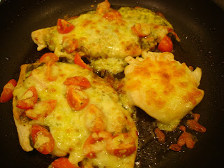 While the chicken cooks, mix the cheese and tomatoes together. Take the chicken out of the pan and wipe out the with with kitchen paper. Return the chicken to the pan, spread each breast with a teaspoon of pesto, then pile the cheese and tomatoes on top.